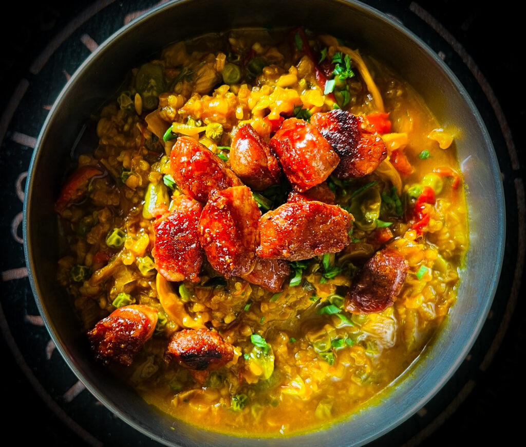 - Give it a stir and taste – if any bits are still chewy, wait another five minutes, or give it another blast with the stove (my preferred method as I like my paella piping hot). Add more water if needed to suit your desired consistency.